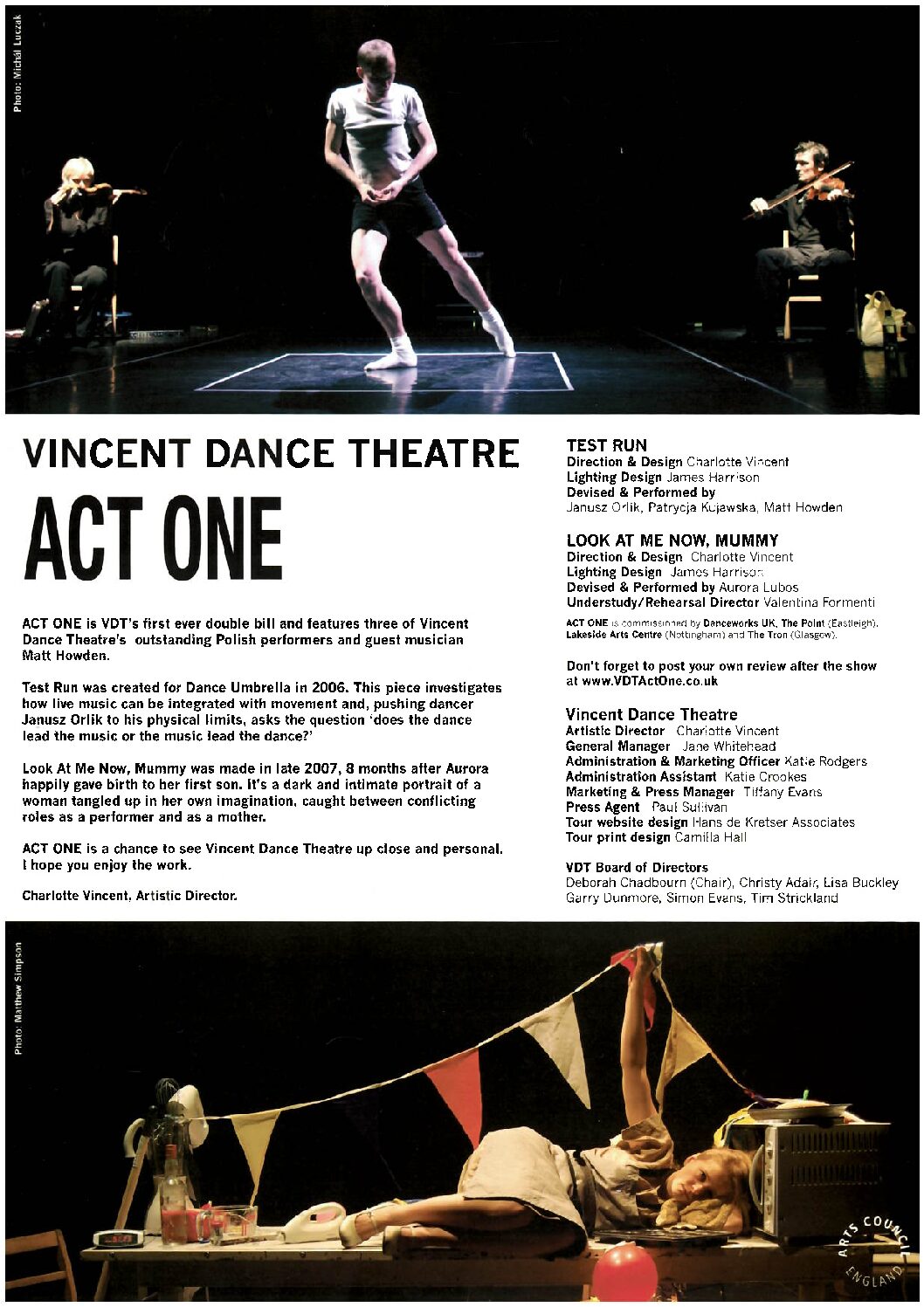 Made in 2008, Look At Me Now, Mummy was originally co-commissioned by Danceworks UK (South Yorkshire), The Point, (Eastleigh), Lakeside Arts Centre (Nottingham) and The Tron Theatre (Glasgow) and funded by Arts Council England.